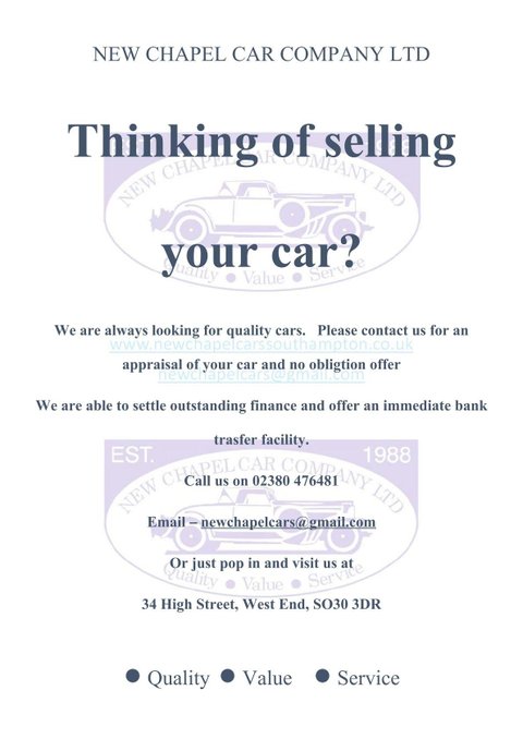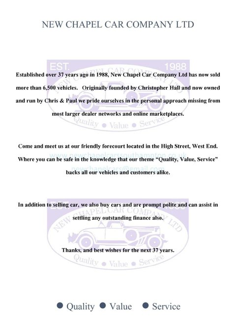 New Chapel Car Company Est 1988. Recipients of multiple Auto Trader Highly Rated awards for Customer Service and 5 Star rated Customer reviews. Check out our reviews on both Auto Trader and Google and see what sets us apart from our competition.