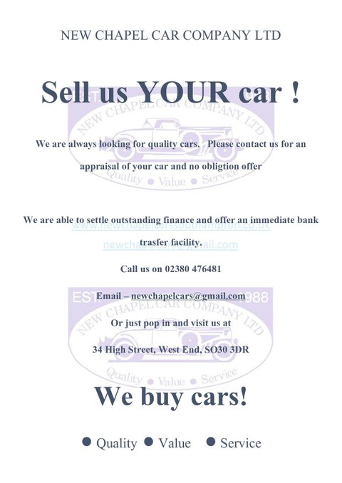 New Chapel Car Company Established 1988. Recipients of multiple Auto Trader Highly Rated awards for Customer Service and 5 Star rated Customer reviews. Check out our reviews on both Auto Trader and Google and see what sets us apart from our competition.