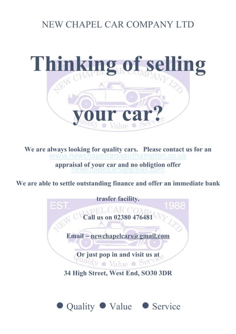 New Chapel Car Company Est 1988. Recipients of multiple Auto Trader Highly Rated awards for Customer Service and 5 Star rated Customer reviews. Check out our reviews on both Auto Trader and Google and see what sets us apart from our competition.